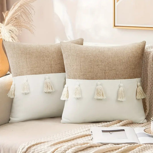 Boho Linen Pillow Covers 2-Pack: Fringe, Beige Brown, Sofa Decor