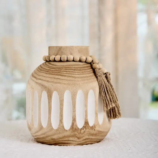Boho Wood Vase Tassel Decor - Handmade Round Vase for Flowers