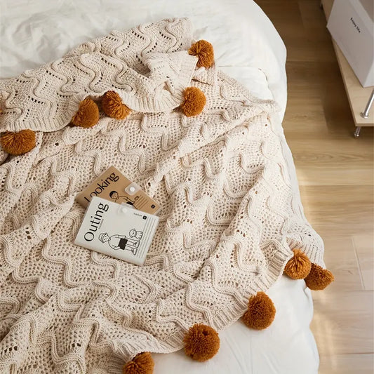 Beige Knit Throw Blanket with Pom Poms - Soft Sofa Bed Cover