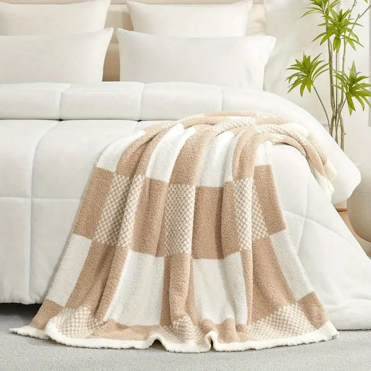 Beige Checkered Flannel Blanket - Soft, Washable 60x80 - Bed/Sofa