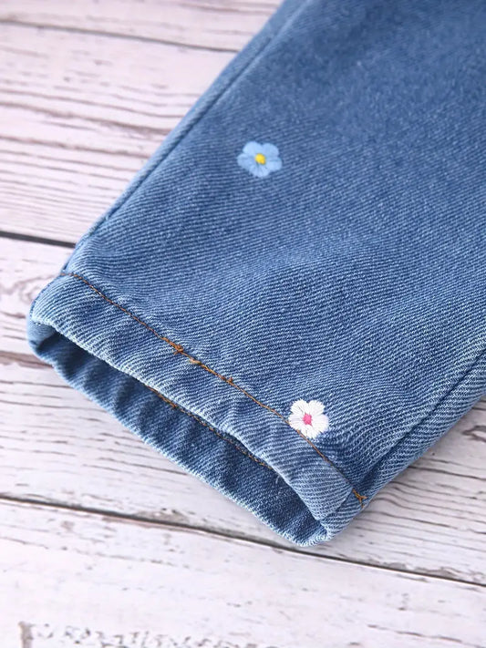 Adorable Girl’s Embroidered Jeans - Soft Rayon Blend, Machine Washable for Fall/Winter with Pockets