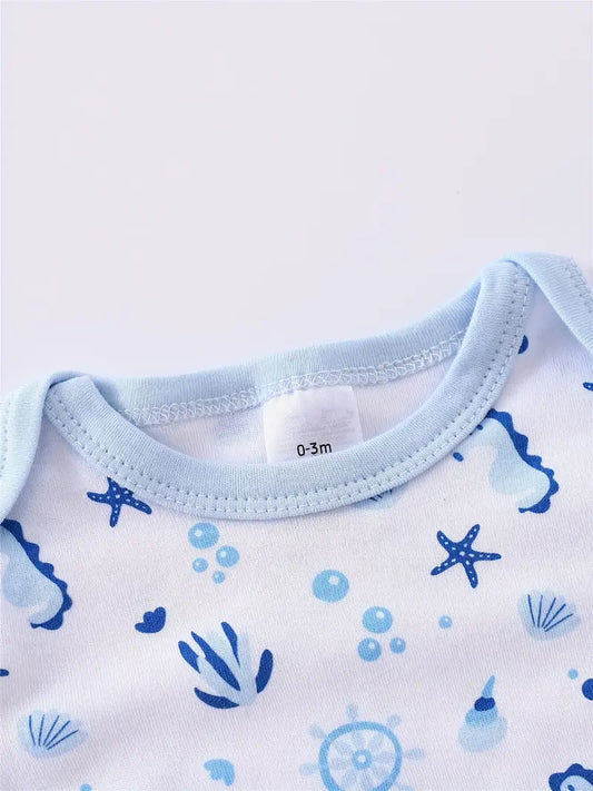 2-Piece Newborn Baby Seahorse Bodysuit Set - Full Print Cotton with Hat & Footed Pants