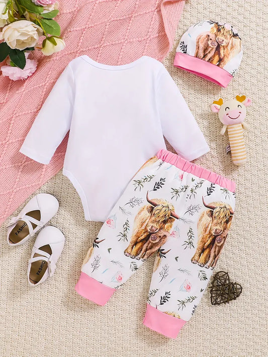 2-Piece Baby Girl Outfit Set | Cartoon Cow Print Bodysuit, Hat & Pants