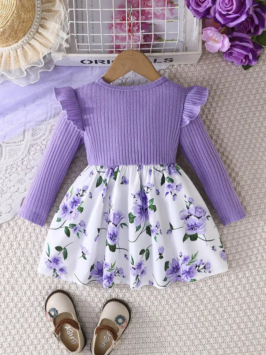 Baby Girls Purple Long Sleeve Dress | Floral Skirt & Waist Bowtie – Fall & Spring Outfit