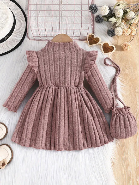 Striped Long Sleeve Dress with Ruffle Trim & Matching Bag | Stylish Outfit for Girls