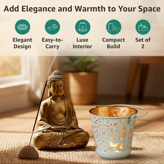 Votive Holders – White Powder-Coated Iron with Gold Interior & Handle – Set of 2 (11cm)