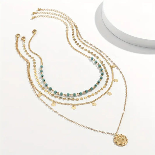 3pcs Bohemian Vintage Necklace Set – Turquoise Stone & Sequin Multilayer Clavicle Chain