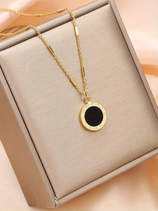 Retro Black Round Pendant Necklace – 18K Gold Plated Roman Clavicle Chain Jewelry