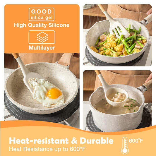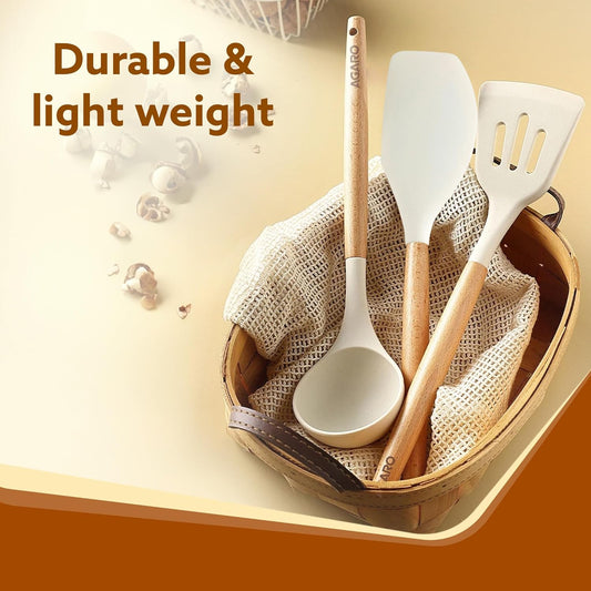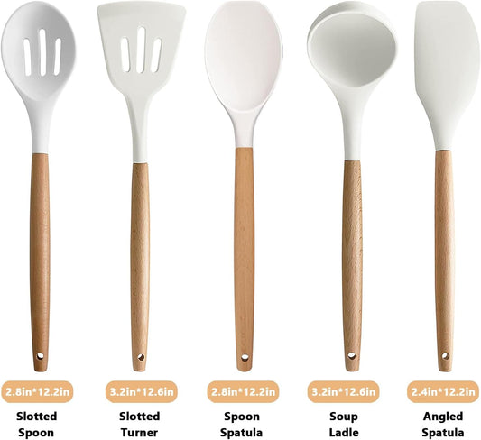 Silicone Spatula & Utensil Set – Kitchen Cooking Tools – Heat-Resistant Silicone, Wood Handle – Cream