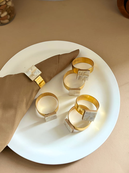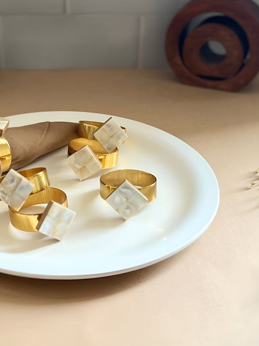 Blue & Gold Toned Square Mother of Pearl Napkin Rings – Table Accessories – Metal & MOP – 6 Pc Set