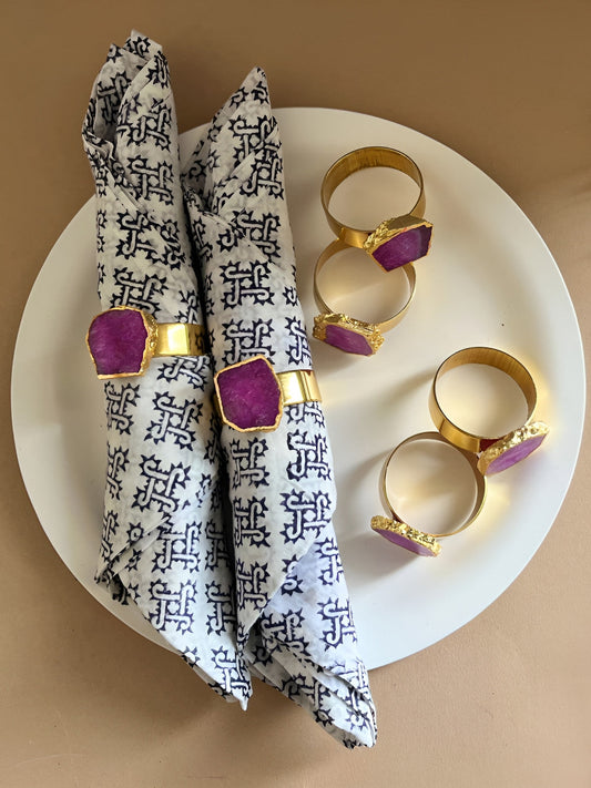 Pink & Gold Toned Crystal Agate Napkin Rings – Dining Tableware – Metal – 6 Piece Set