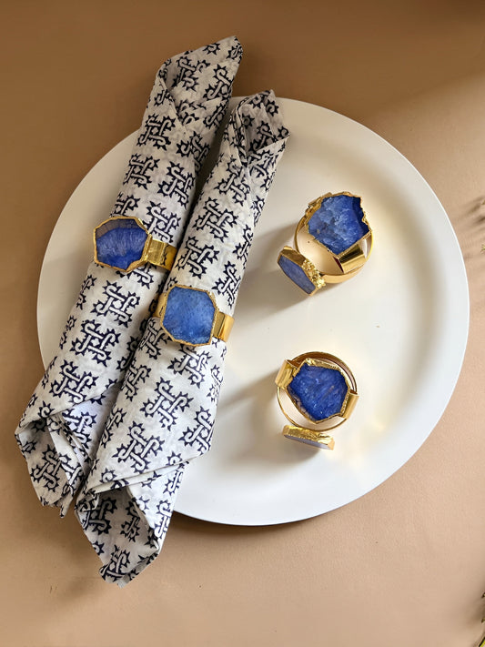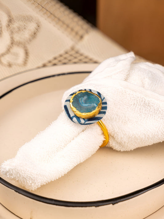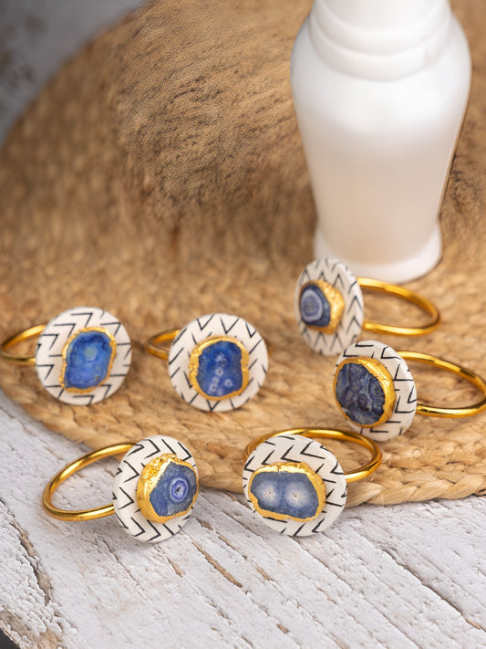 Blue & Gold Toned Crystal Agate Napkin Rings – Dining Tableware – Metal, Agate Embellished – 6 Piece Set