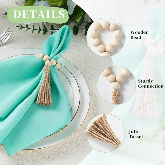 Wooden Bead Napkin Rings – Tabletop Accessories – Natural Wood, Tassel, Elastic – 6-Pack