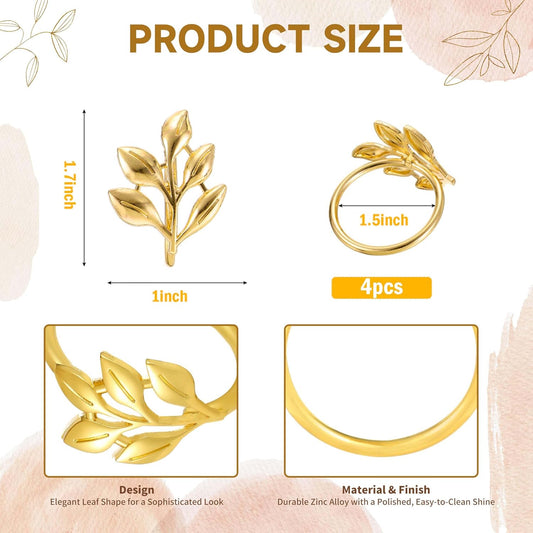 Golden Leaf Design Napkin Rings – Premium Table Setting Accessories – Durable Metal Construction – Set of 4