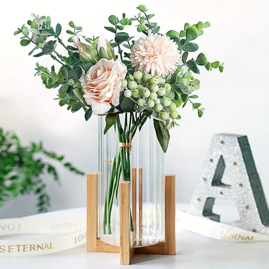8" Ribbed Glass Vase - Wood Base, Centerpiece Candle Holder