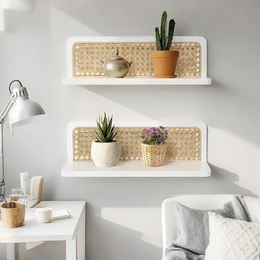 White Rattan Wall Shelf - Bohemian Modern Floating Shelf with Hooks