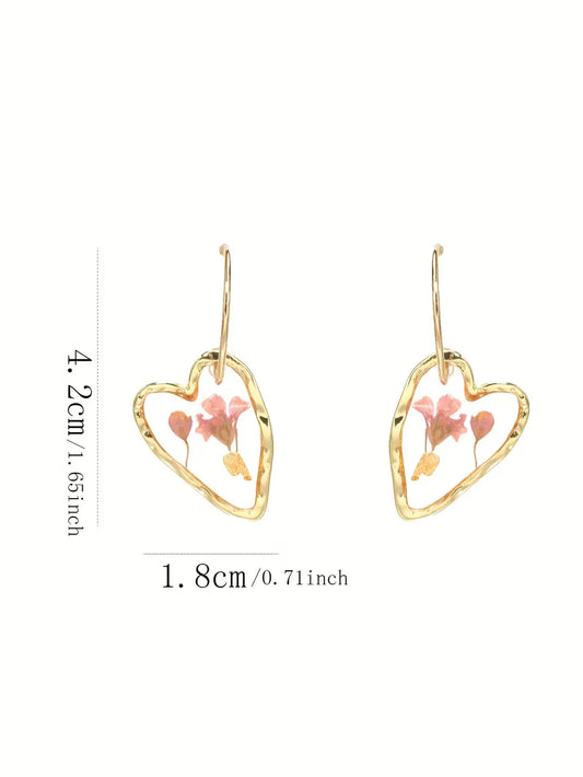 Sweet Love Heart Dried Flower Pendant Design Hoop Earrings