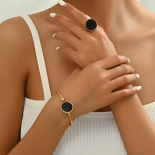 Ensemble bracelet manchette ouvert et bague réglable plaqué or 14 carats, style simple et élégant