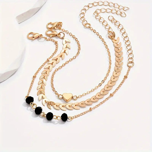 3 Pcs Set Of Tiny Golden Bracelet With Black Beads Heart Design