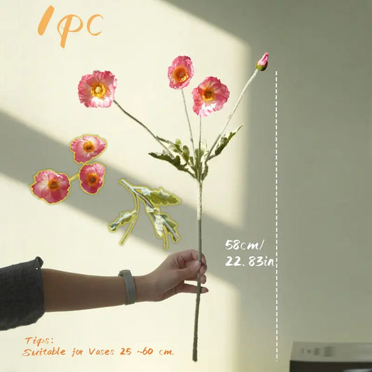Fleur de pavot rose artificielle avec bourgeons – Tige florale en soie pour bricolage, décoration de maison et de mariage