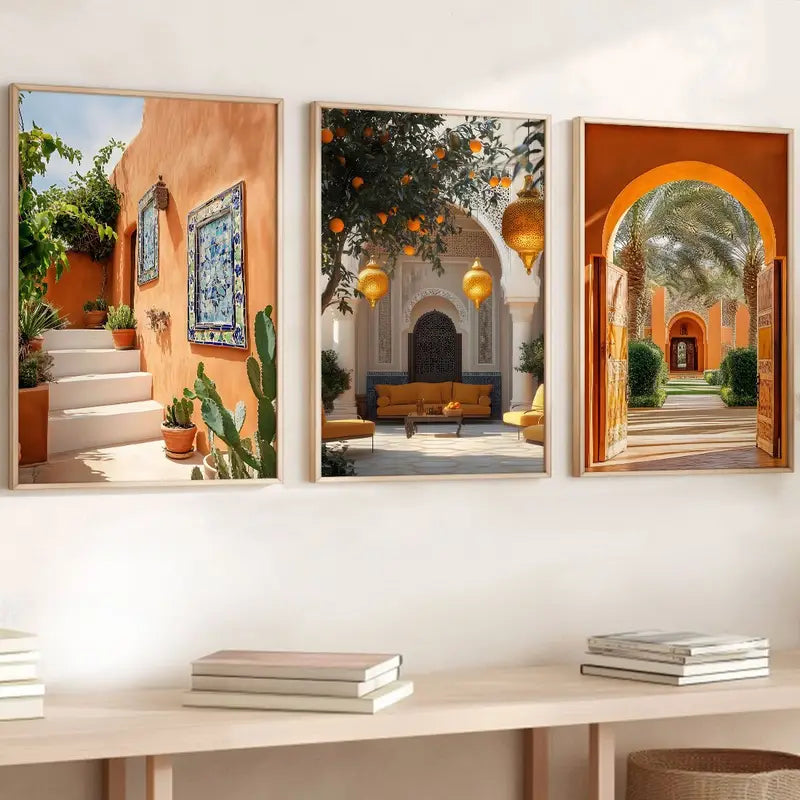 Lot de 3 impressions sur toile modernes orange, botaniques et architecturales – Décoration murale sans cadre pour la maison et le bureau