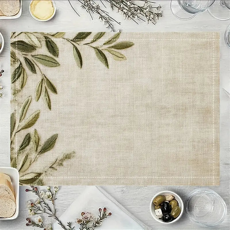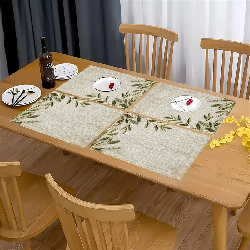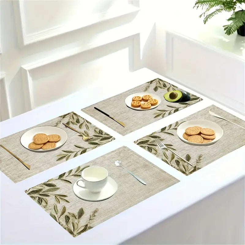 4-Piece Beige Printed Linen Placemats - 12x18 Inch Waterproof Rectangular Table Mats - Stylish Holiday or Everyday Dining Decor - No Tassels or Embroidery