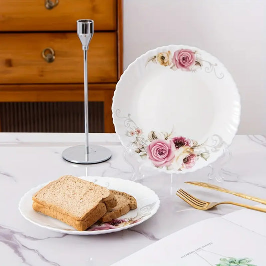 4PCS Tempered Opal Glass Plates – Rose Design, Dishwasher Safe Dinnerware