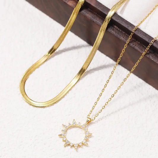 Zircon Sun Pendant Necklace - Stainless Steel Snake Chain Jewelry