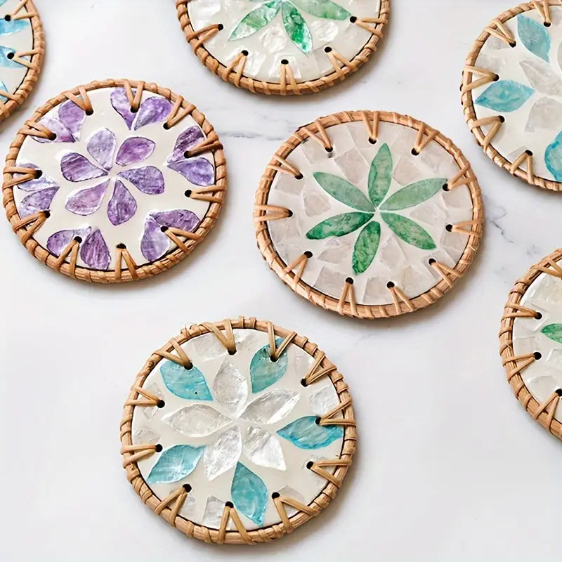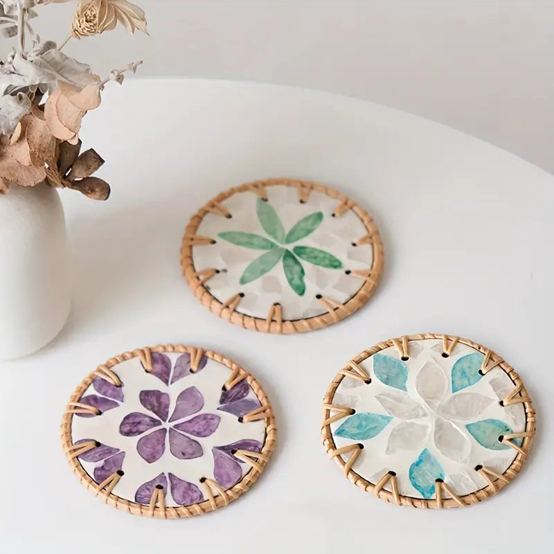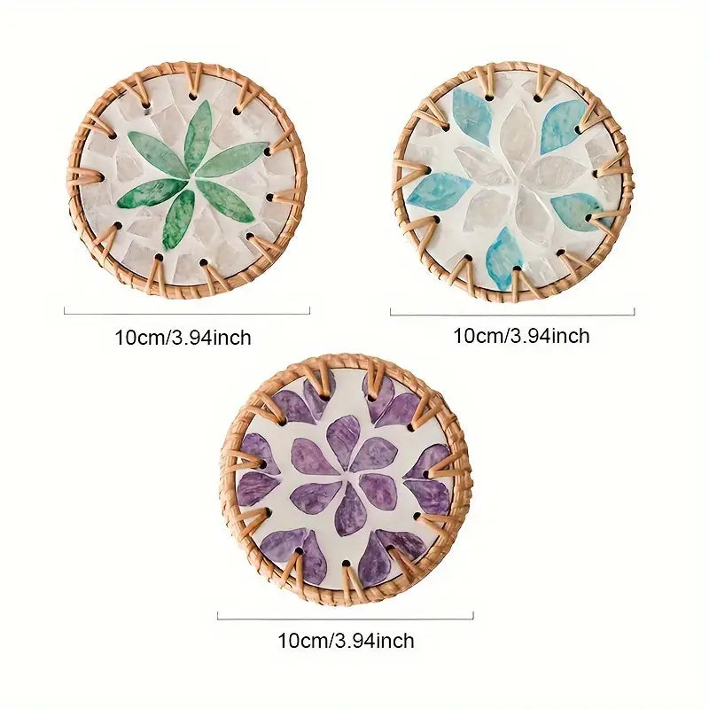 Set van 3 handgemaakte keramische onderzetters met rotanvlechtwerk