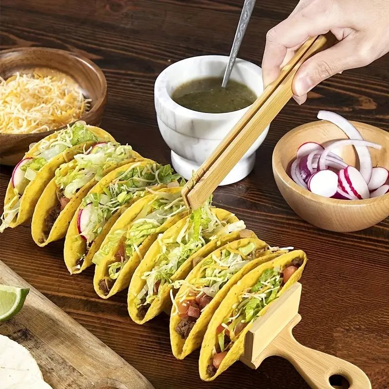1PC Wooden Taco Holder Rack - Holds 7 Soft or Hard Shell Tacos, Bamboo Stand for Burritos, Ideal Taco Tray for Home, Parties & Restaurants