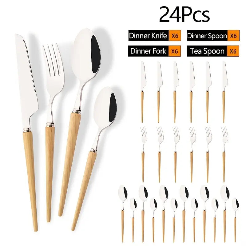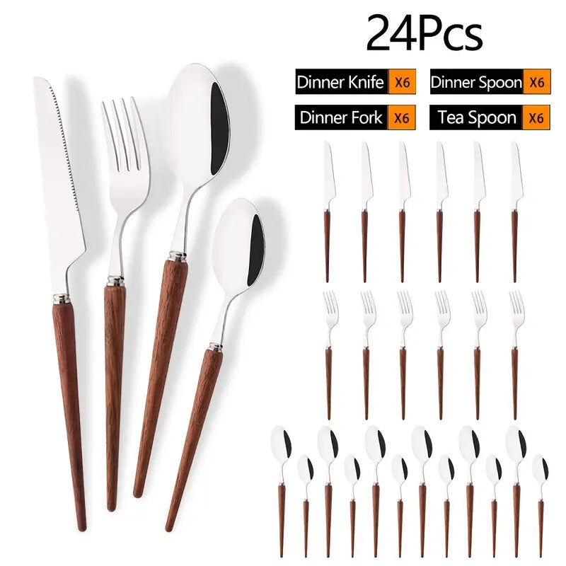 24PC Cutlery Set with Wooden Handles – Elegant Stainless Steel Dinnerware