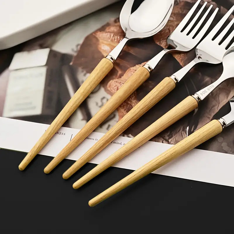 24-Piece Stainless Steel Cutlery Set with Wooden Handles - Elegant Dinnerware for 6 - Knives, Forks, Spoons, Teaspoons - Stylish Home Dining Silverware