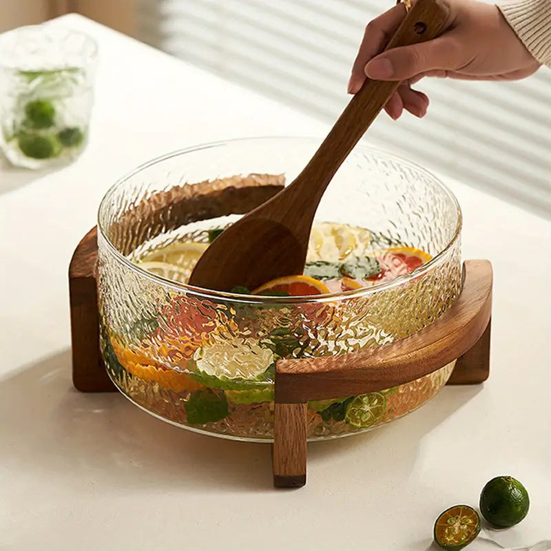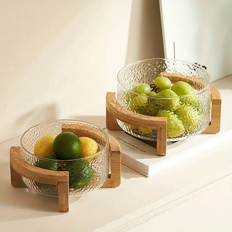 2PCS Glass Fruit Bowls with Wooden Base – Elegant Salad & Snack Bowl Set