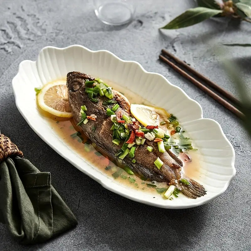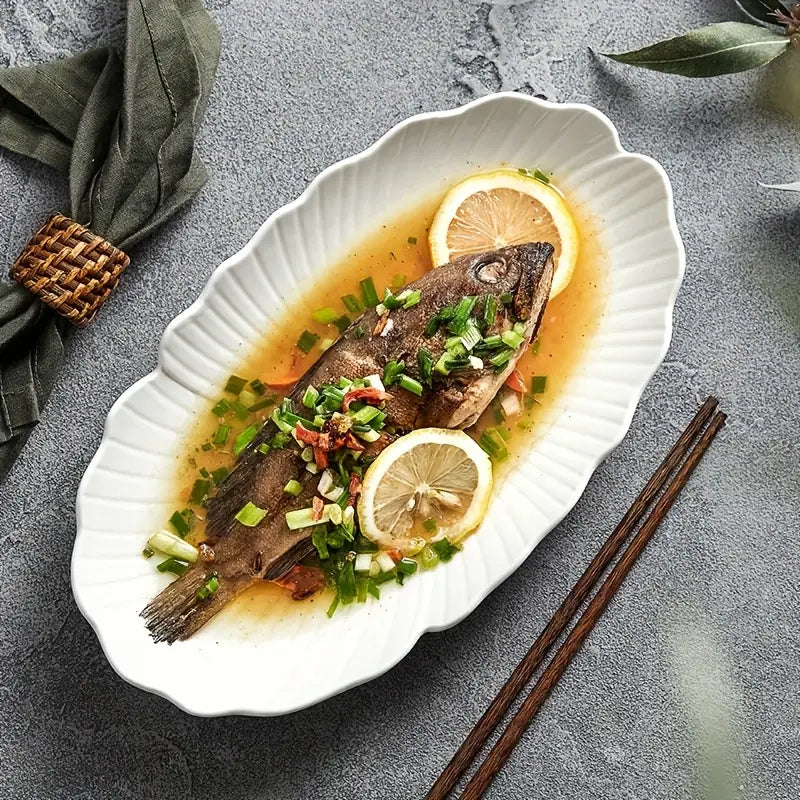 2PCS White Oval Ceramic Fish Plates - Large Elegant Serving Dishes with Floral Pattern - Ideal for Grilling, Steaming, Dinner Parties