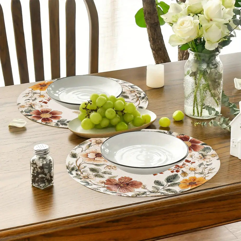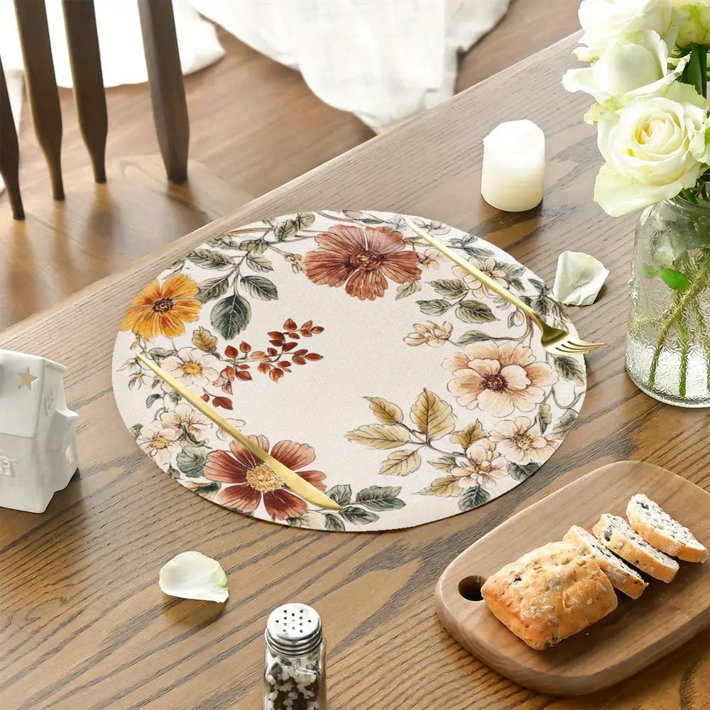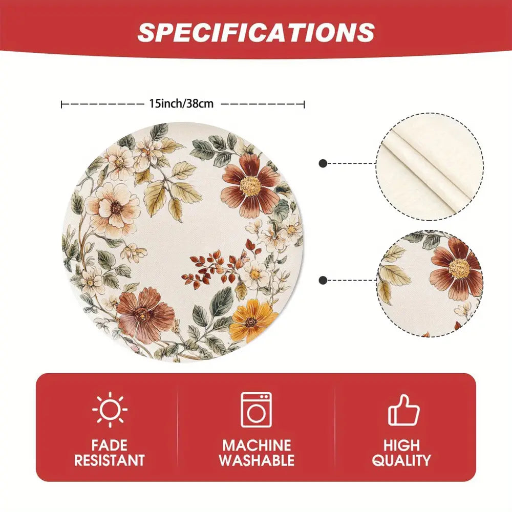 Set van 4 gele linnen placemats met bloemenkrans - 38 cm rond, handwasbaar voor eetkamer- en keukendecoratie