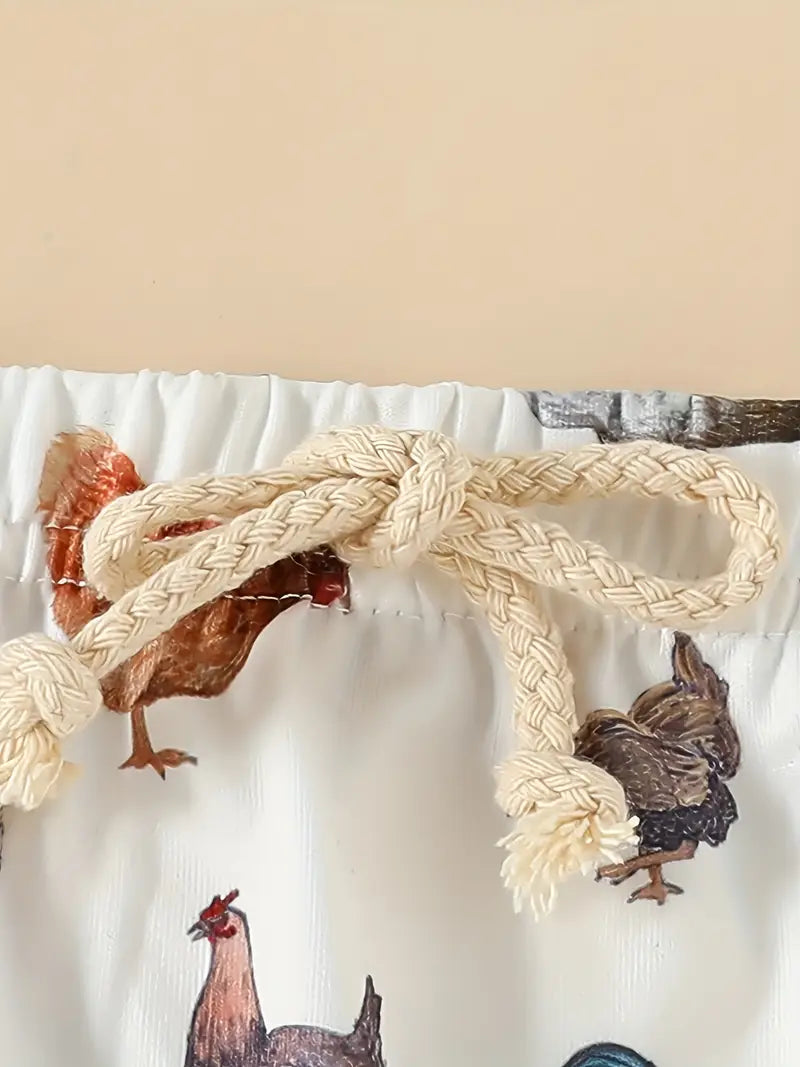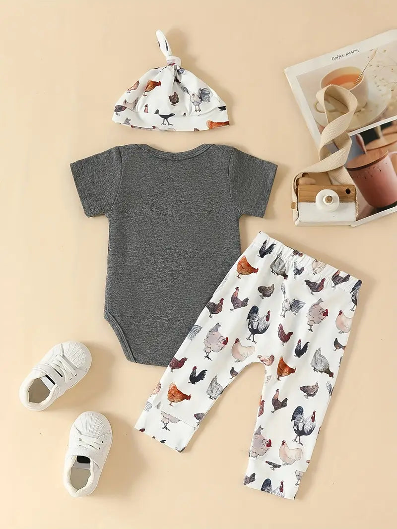 Schattige baby-jongensoutfit | Hen Print Onesie met korte mouwen, broek en mutsset
