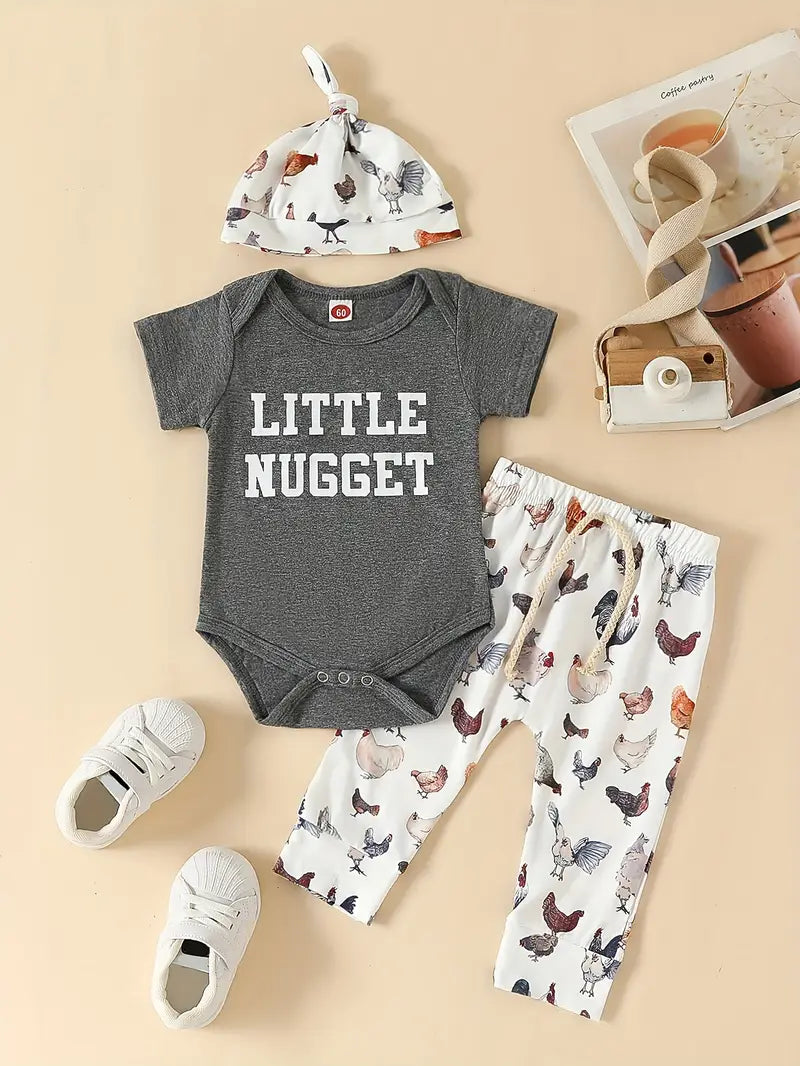 Schattig "Little Nugget" rompertje met korte mouwen en een broekje en muts met een afbeelding van een hen, 3-delige buitenset voor baby's, buitenkleding