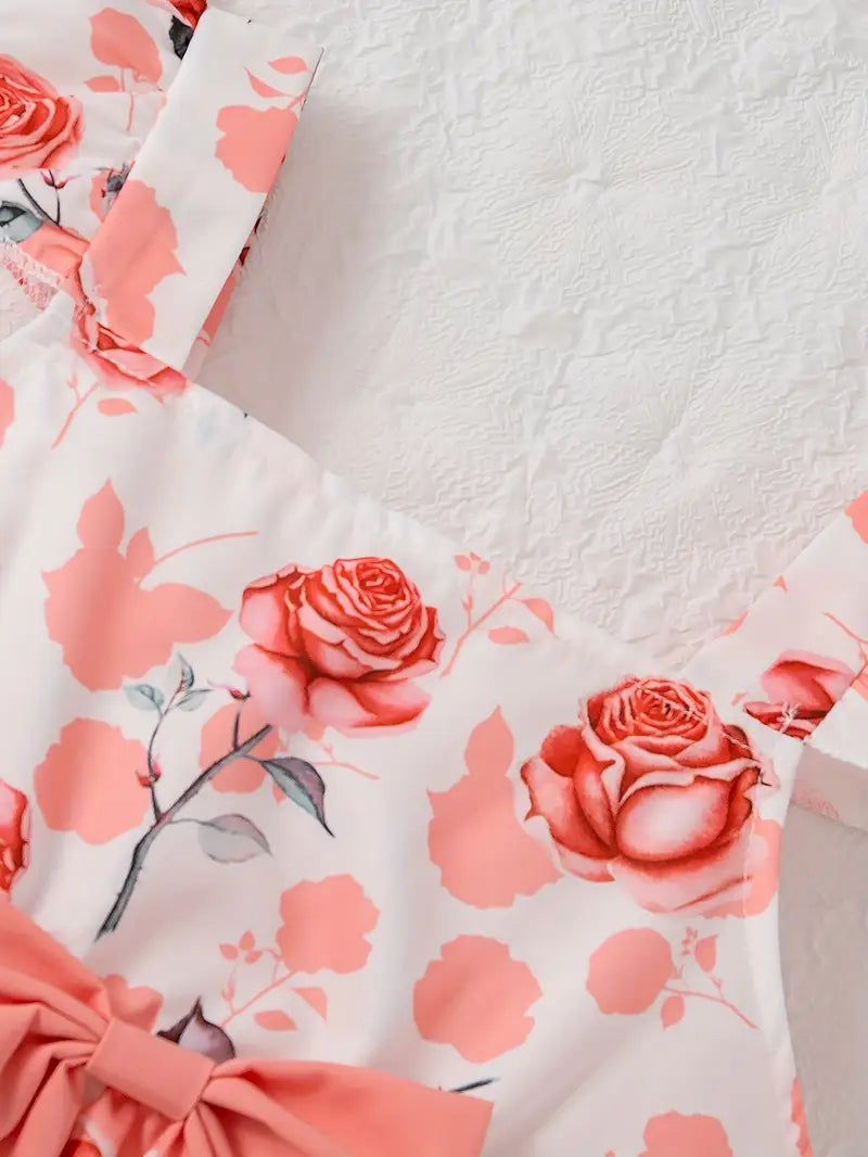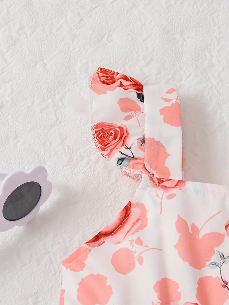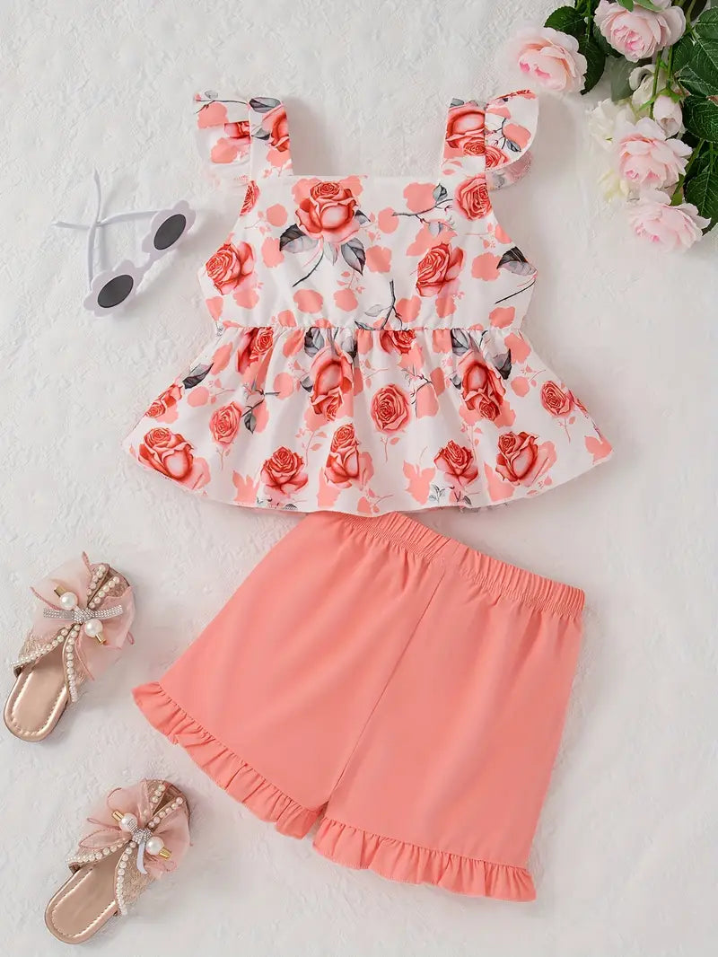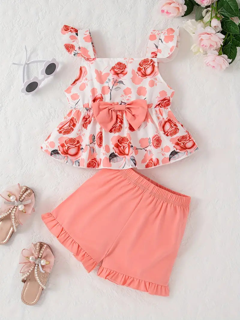 3-delige set met schattige bloemenprint, strik, ruches en camisole, top, shorts en hoofdband voor babymeisjes, kleding en buitenkleding