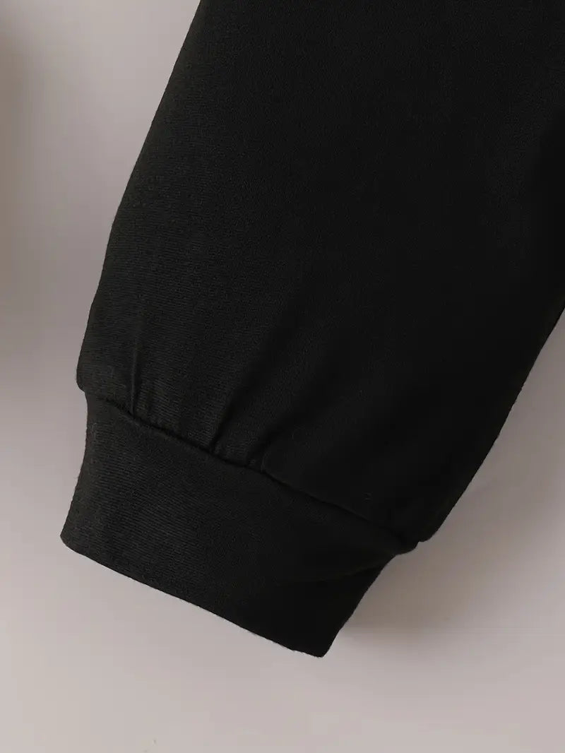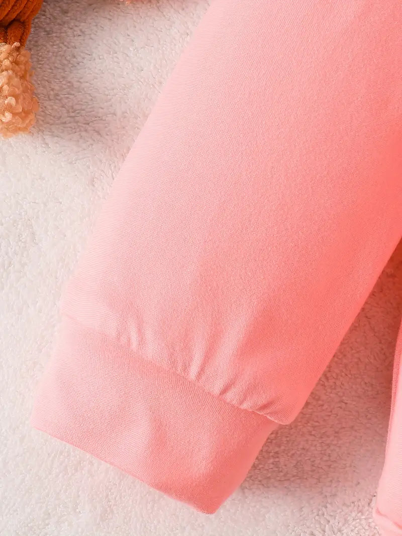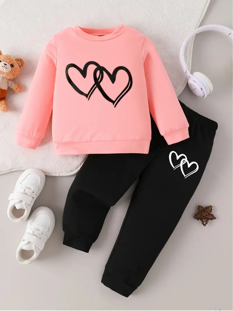 Meisjes 2-delige lente/herfst outfitset, casual top met ronde hals en lange mouwen met hartjesprint en bijpassende broek, polyester 95% spandex 5% gebreide stof, normale pasvorm - roze en zwart, voor buiten