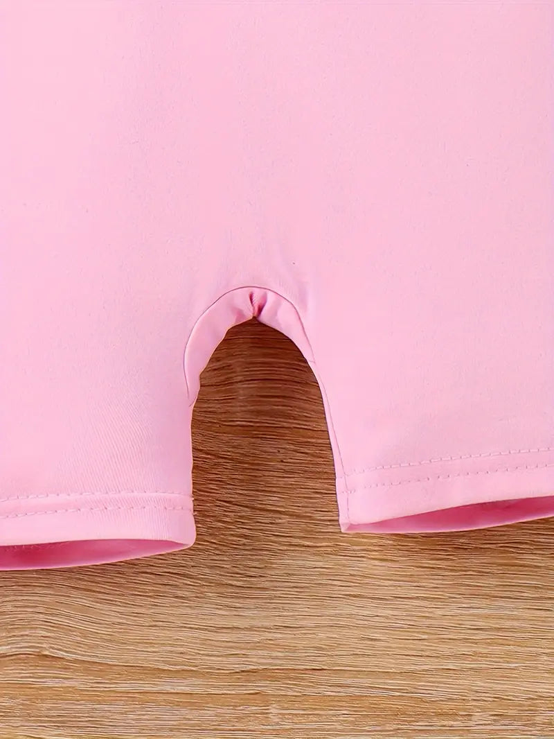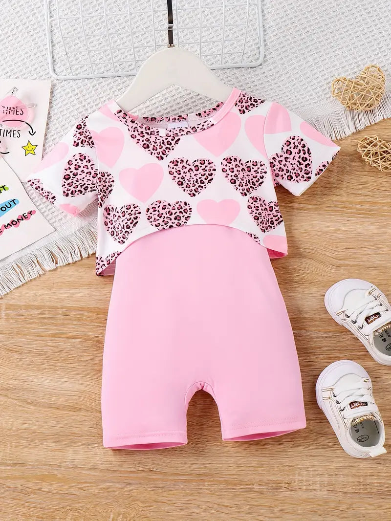 1 set Valentijnsdag-top met hartjesprint en korte mouwen voor babymeisjes en roze romper, casual zomeroutfit, gebreide polyesterstof, rekbaar shortsuit met normale pasvorm, voor buiten