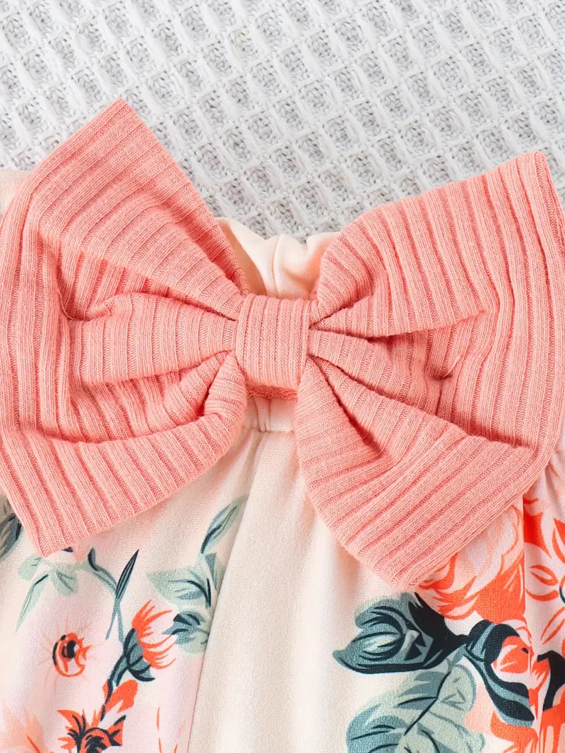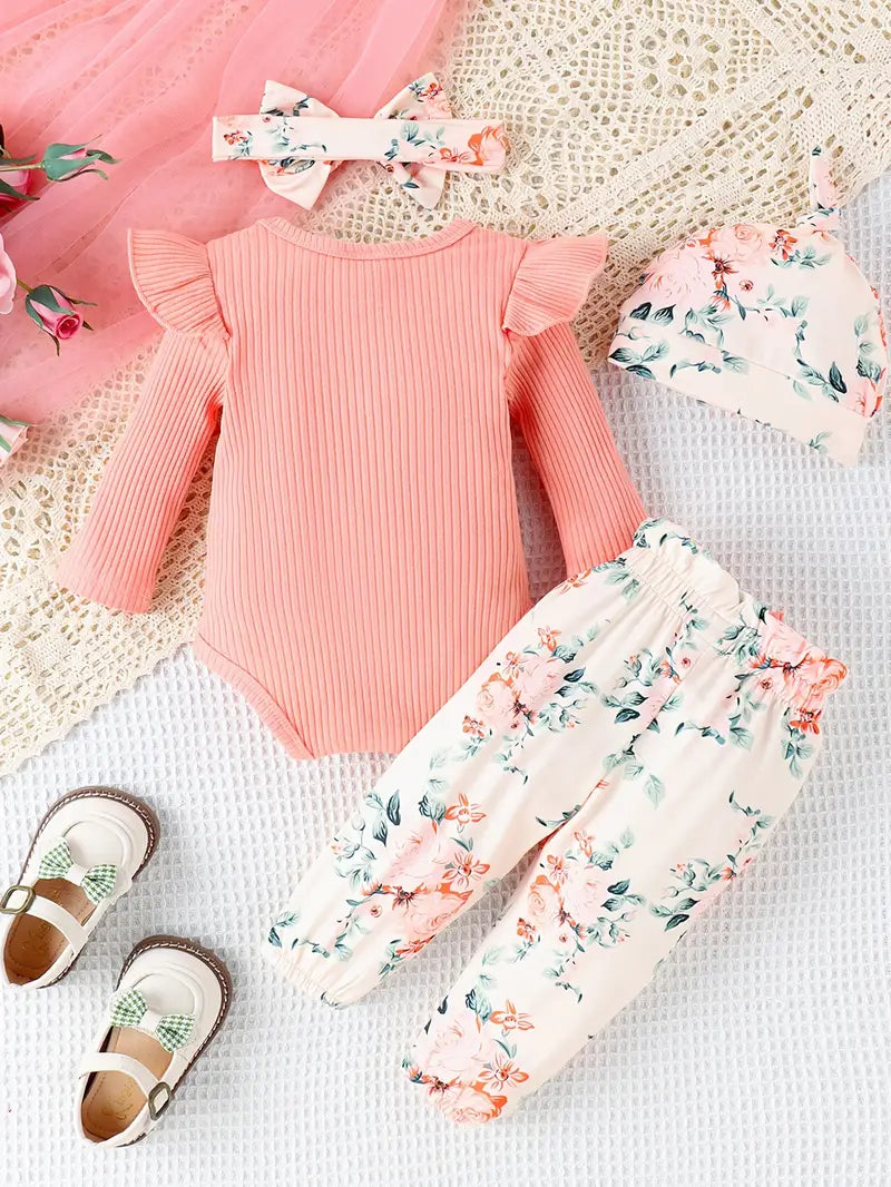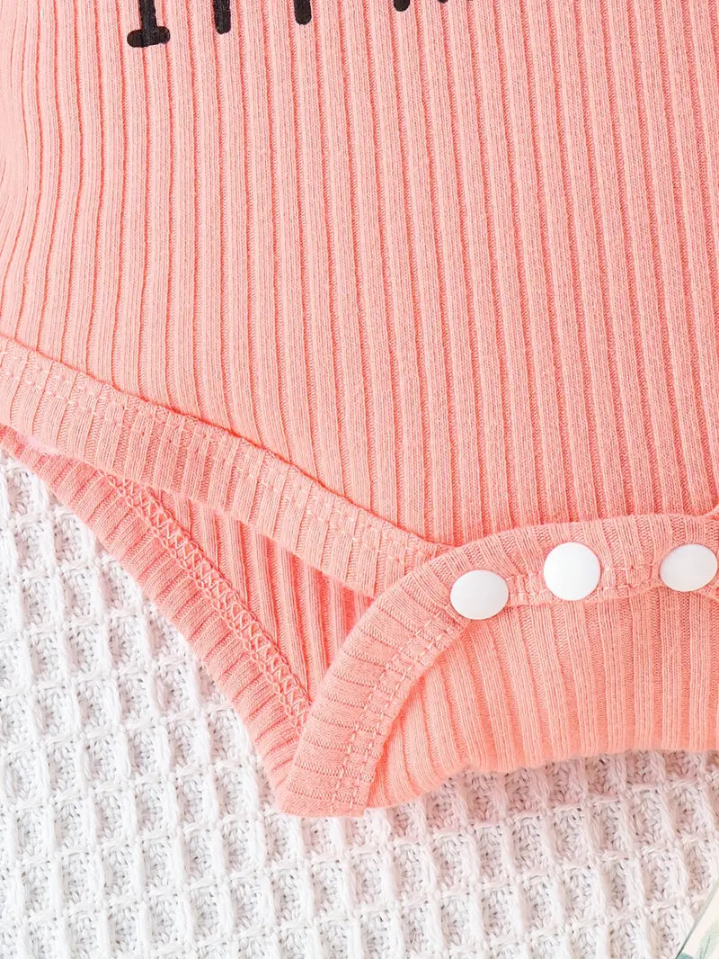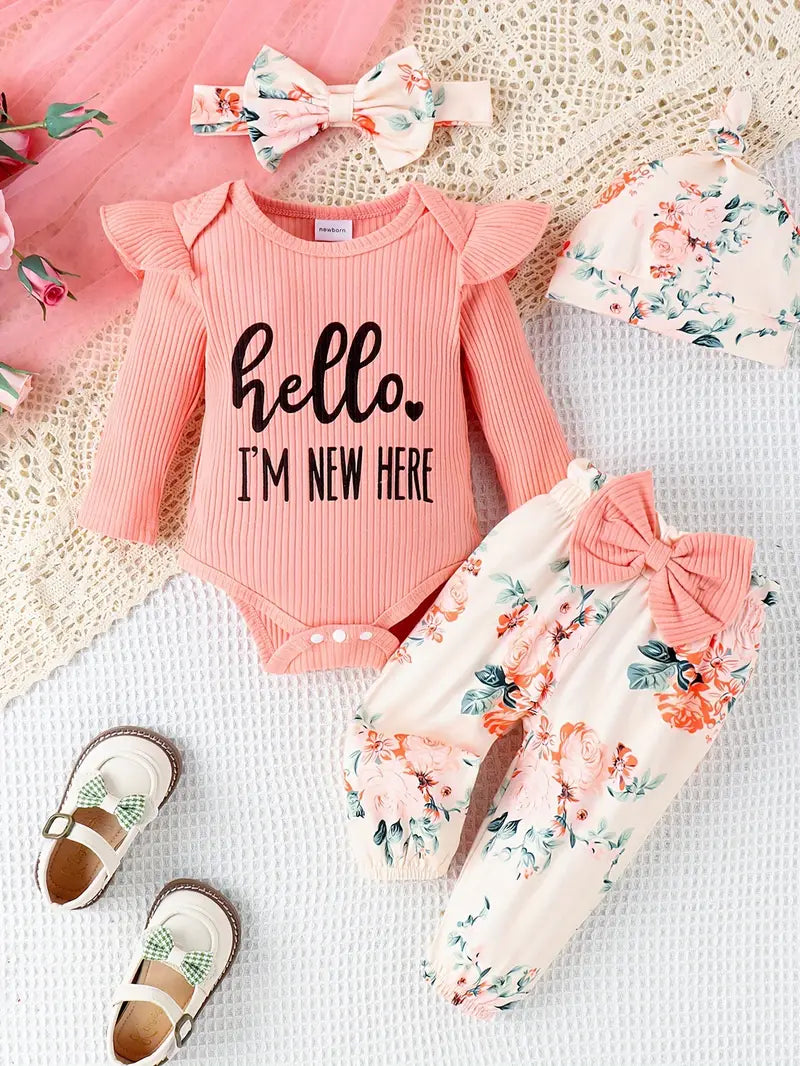 Outfit voor pasgeboren meisje | Rompertje met letterprint, geribbelde broek, hoedje en hoofddoek