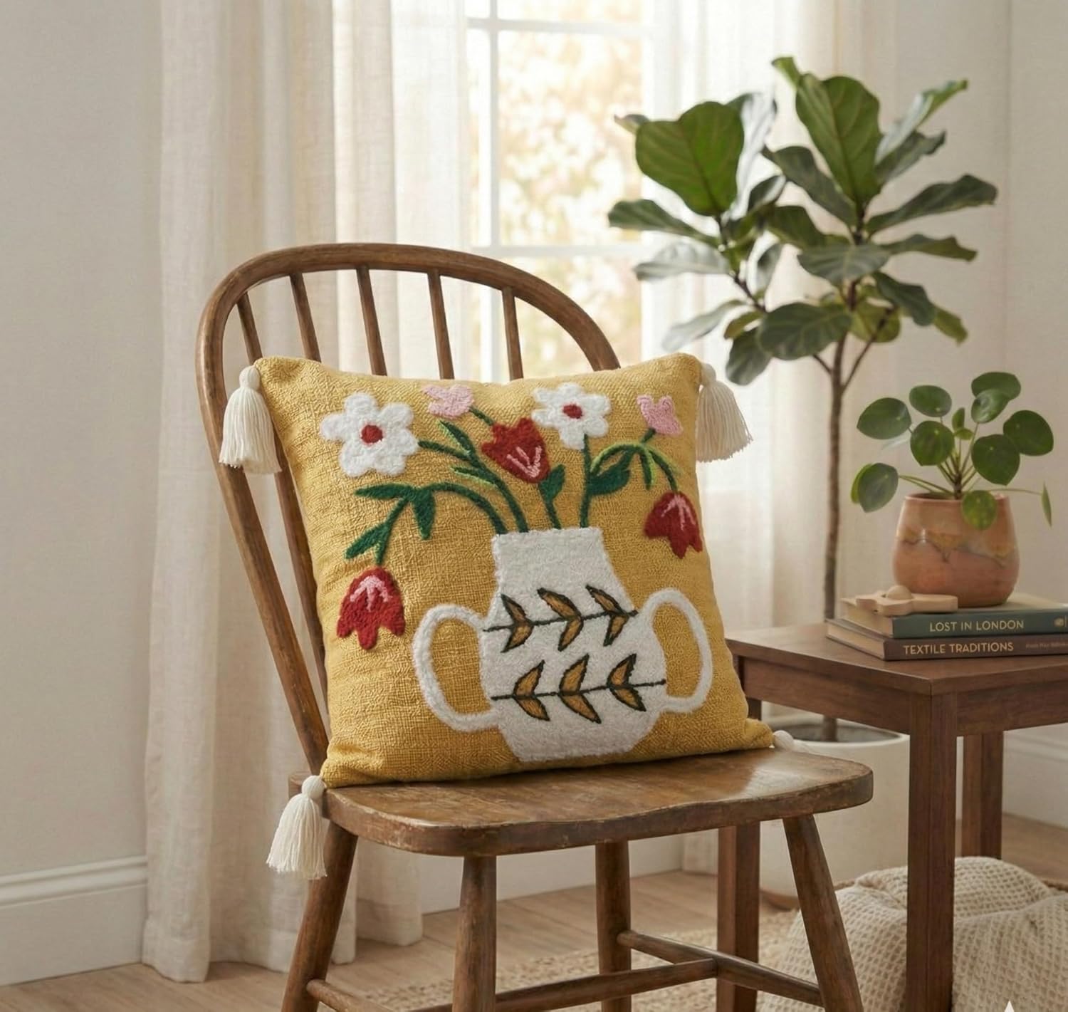 This cushion cover is offered in a yellow mustard vintage-style colour. It complements various interior themes, including modern farmhouse, minimalist, and eclectic bohemian.