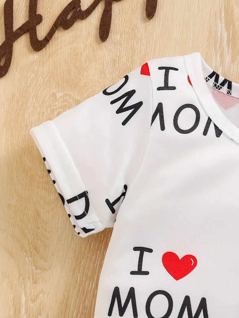 ‘I Love Mom’ Baby Bodysuit | Allover Print Short Sleeve Romper for Boys