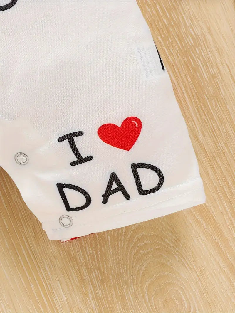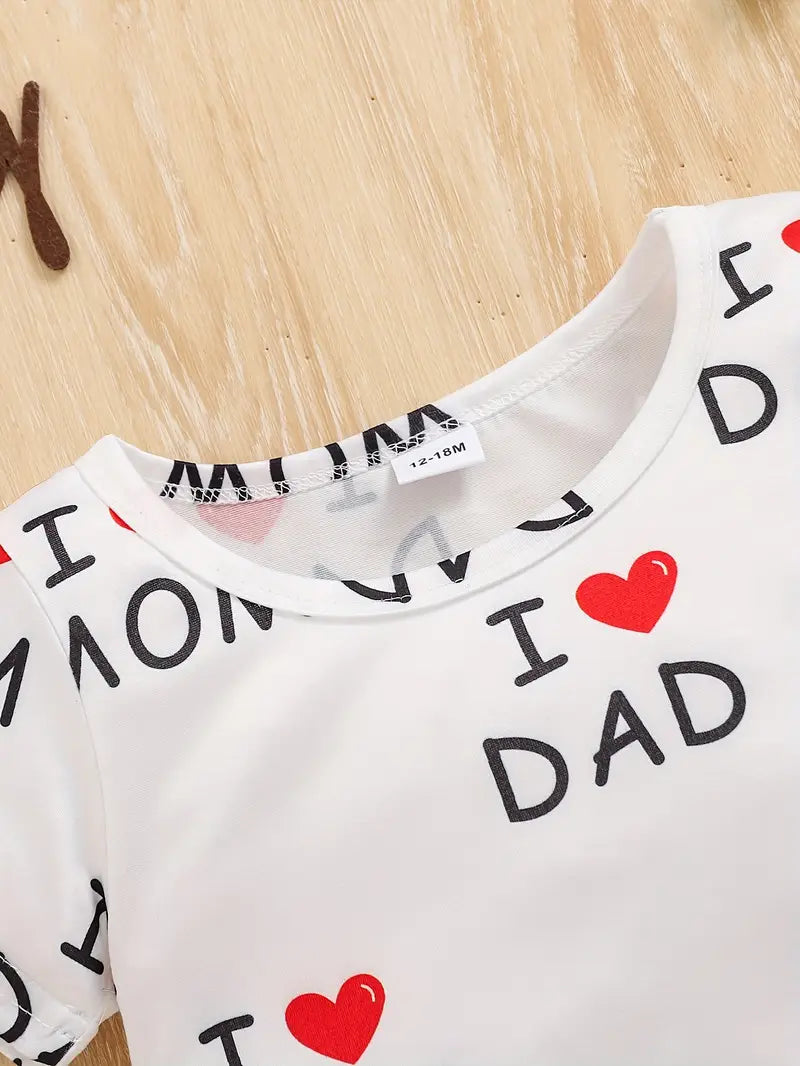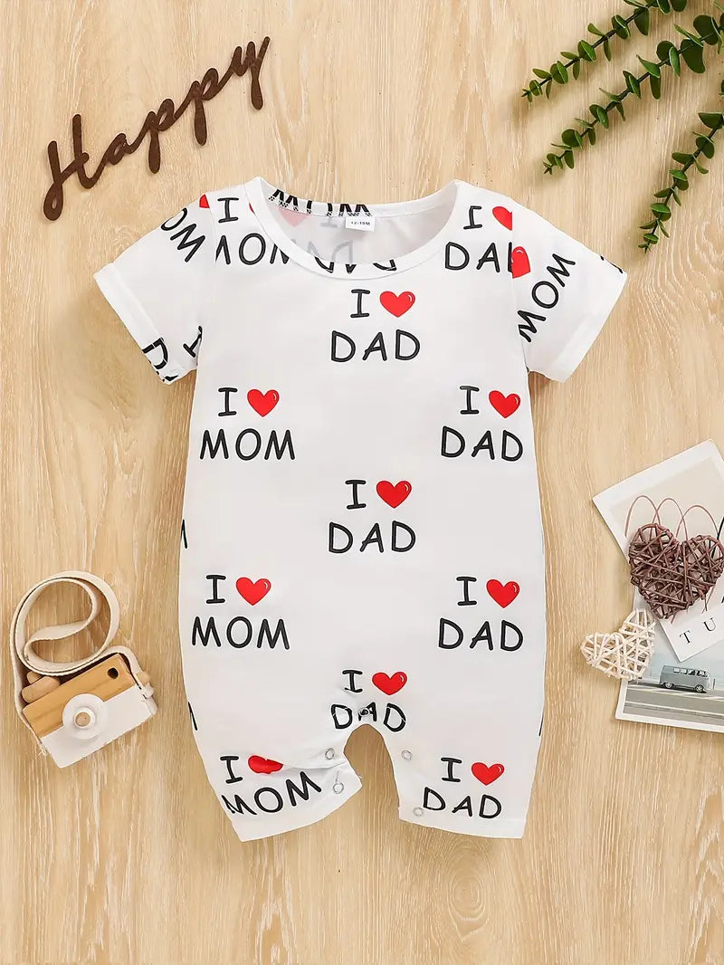 Infant's "I Love Mom & I Love Dad" Allover Print Bodysuit, Casual Short Sleeve Romper, Baby Boy's Clothing For Summer/Spring